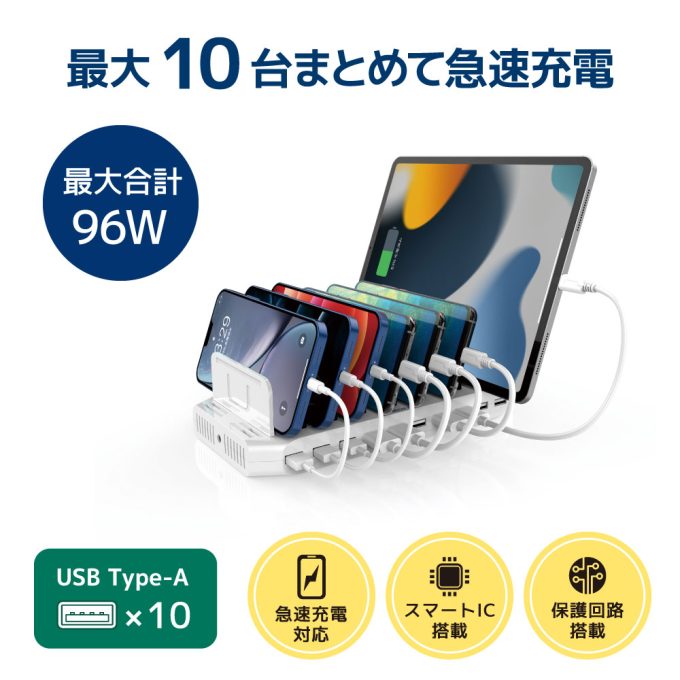 合計最大96W!USB Type-Aを10ポート備えたUSB急速充電器特長